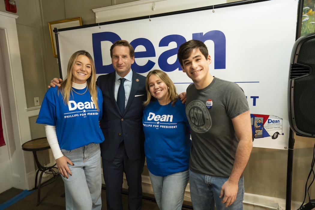 Brooke Fleming '24, Caitlin LeSage '25 and Andrew Jones '25 with Rep. Dean Phillips (D-Minn.), at a meet and greet with the candidate at the Metropolitan Coffee House in North Conway, N.H.